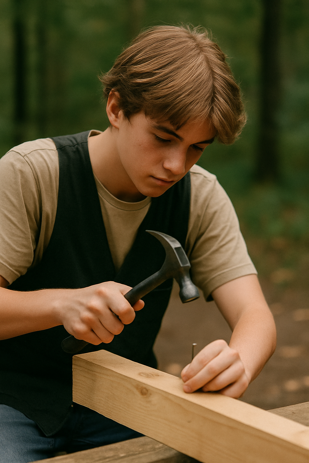 Her arbejder vi med hænderne, kroppen og hverdagen. Nogle dage bygger vi med træ, maler, sorterer eller rydder op. Andre dage går vi ture i nærområdet, laver bål, planter i haven eller laver noget praktisk sammen i køkkenet.